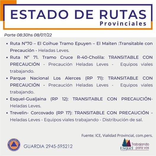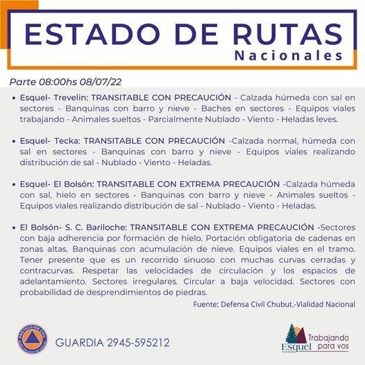 Además la Municipalidad de Esquel realizó un parte de rutas y lo difundió por las redes sociales oficiales.