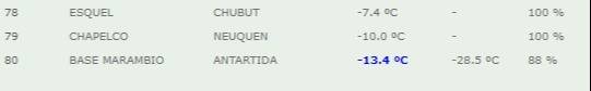 El Servicio Meteorológico Nacional dio a conocer el ranking de las ciudades más frías del país, entre las que se encuentra Esquel con -7.4ºC.