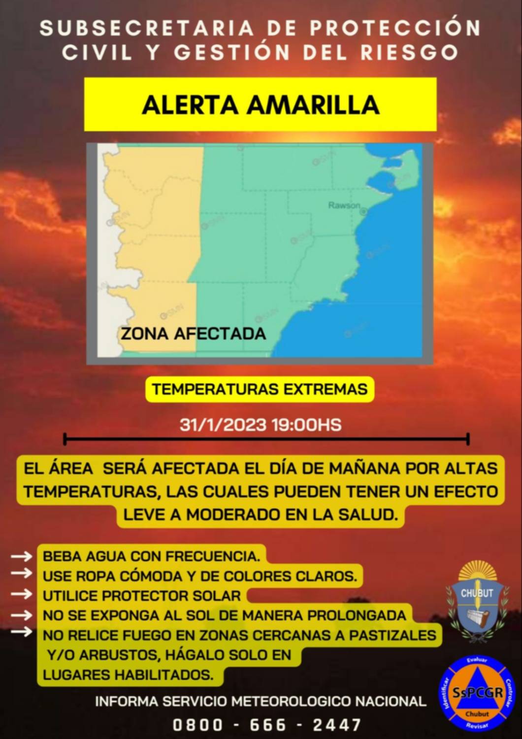 La Subsecretaría de Protección Civil de Chubut, dio a conocer un alerta amarillo emitido por el Servicio Meteorológico Nacional que indica las altas temperaturas que se esperan este miércoles en la región cordillerana.