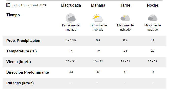 Se anuncia una jornada con cielo nublado, vientos en hora de la tarde y noche y muy poca probabilidad de precipitaciones.