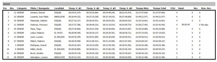 El piloto de Esquel, Giovanni Simeoni lideró la categoría Senior, segundo se ubicó el barilochense Juan Pablo Luzzardi, El podio de la mayor se completó con otros tres riders esquelenses: Valentín Matamala, Francisco Freeman y Tiago Mesa.