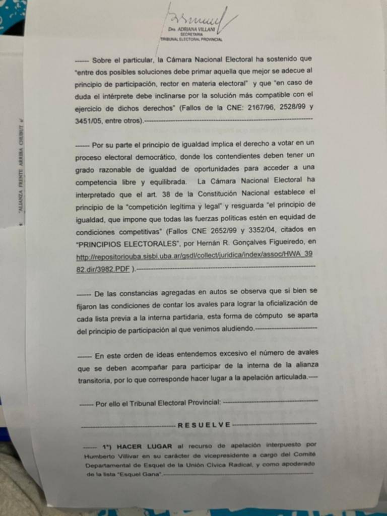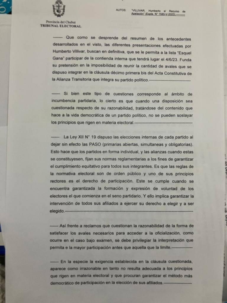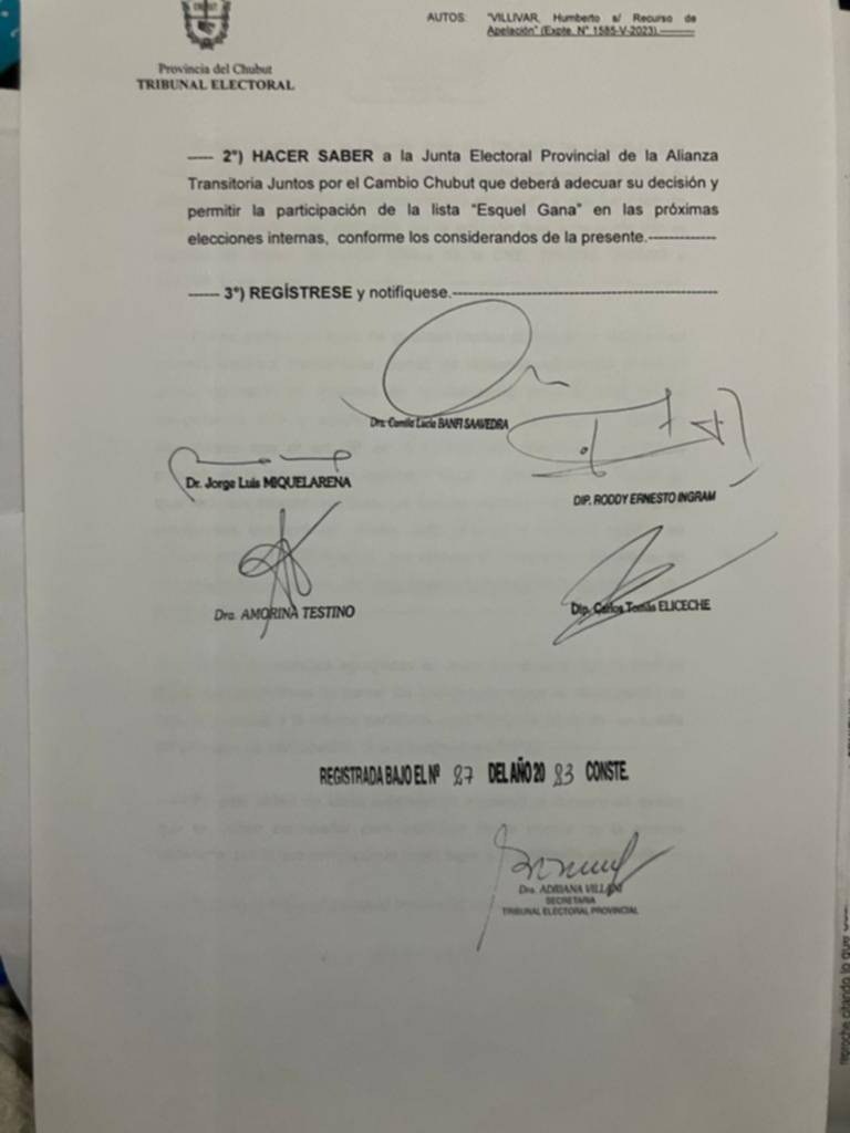 En este sentido, emitieron un comunicado en donde expresan que la Junta Electoral Provincial de la Alianza transitoria Juntos por el Cambio, «deberá adecuar su decisión y permitir la participación de la lista «Esquel Gana» en las elecciones internas».