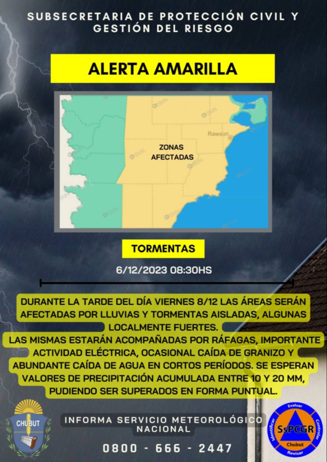La Subsecretaría de Protección Civil y Gestión del Riesgo, emitió una alerta amarilla por tormentas para el próximo viernes en gran parte de la provincia del Chubut.