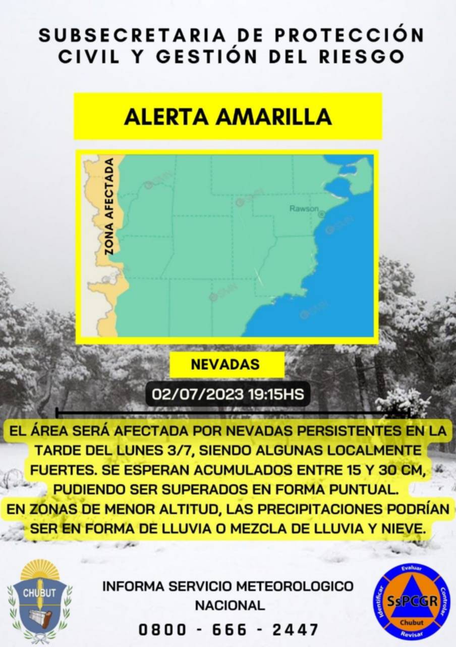 Desde la Subsecretaría de Protección Civil y Gestión del Riesgo de la provincia informaron que hay alerta amarilla por nevadas en toda la cordillera de Chubut.