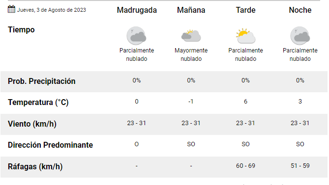 Según la información oficial que publica el sitio web del Servicio Meteorológico Nacional, este día jueves en la ciudad de Esquel, tendremos una temperatura máxima de 6°C.