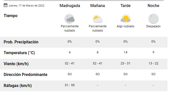 Según los datos oficiales que brinda la página del Servicio Meteorológico Nacional, este día jueves en la ciudad de Esquel tendremos una temperatura máxima de 14°C.
