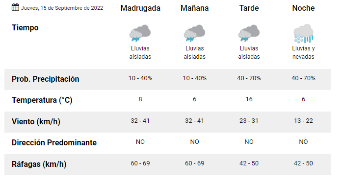 Según la información oficial que brinda la página del Servicio Meteorológico Nacional, este día jueves en la ciudad de Esquel, tendremos una temperatura máxima de 16°C.