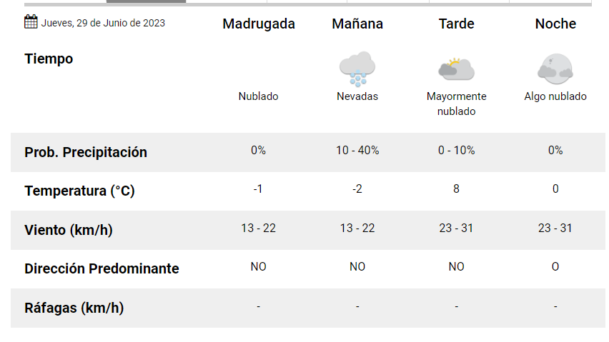 Según la información que brinda la página oficial del Servicio Meteorológico Nacional, este día jueves en la ciudad de Esquel, tendremos una temperatura máxima de 8°C.