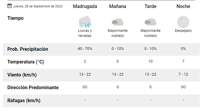 Según la información oficial que brinda la página web del Servicio Meteorológico Nacional, este día jueves en la ciudad de Esquel tendremos una temperatura máxima de 10°C.
