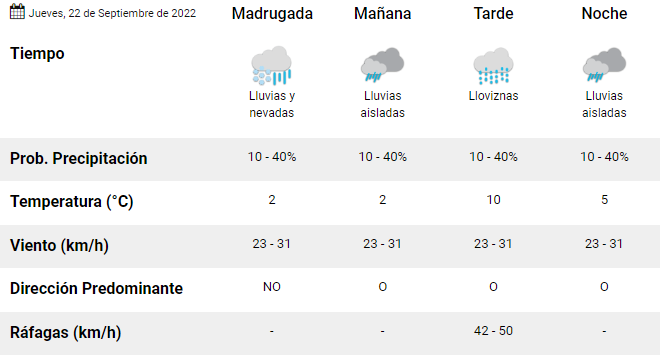 El Servicio Meteorológico Nacional anunció para este jueves 22 de septiembre una temperatura mínima de 2°C y una máxima que alcanzaría los 10°C.