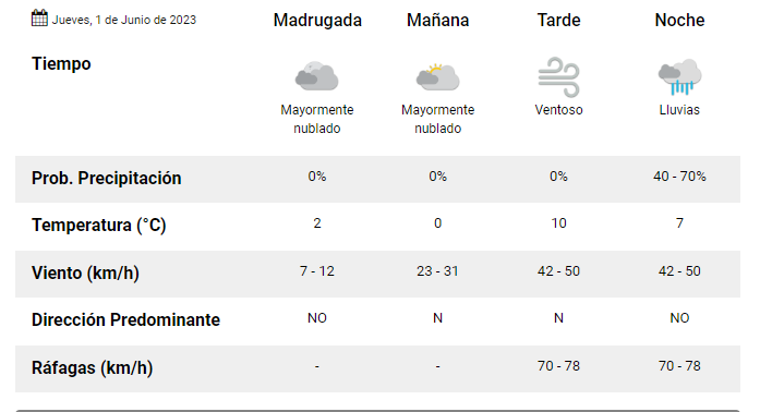 Según la información oficial que brinda la página web del Servicio Meteorológico Nacional, este día jueves en la ciudad de Esquel tendremos una temperatura máxima de 10°C.