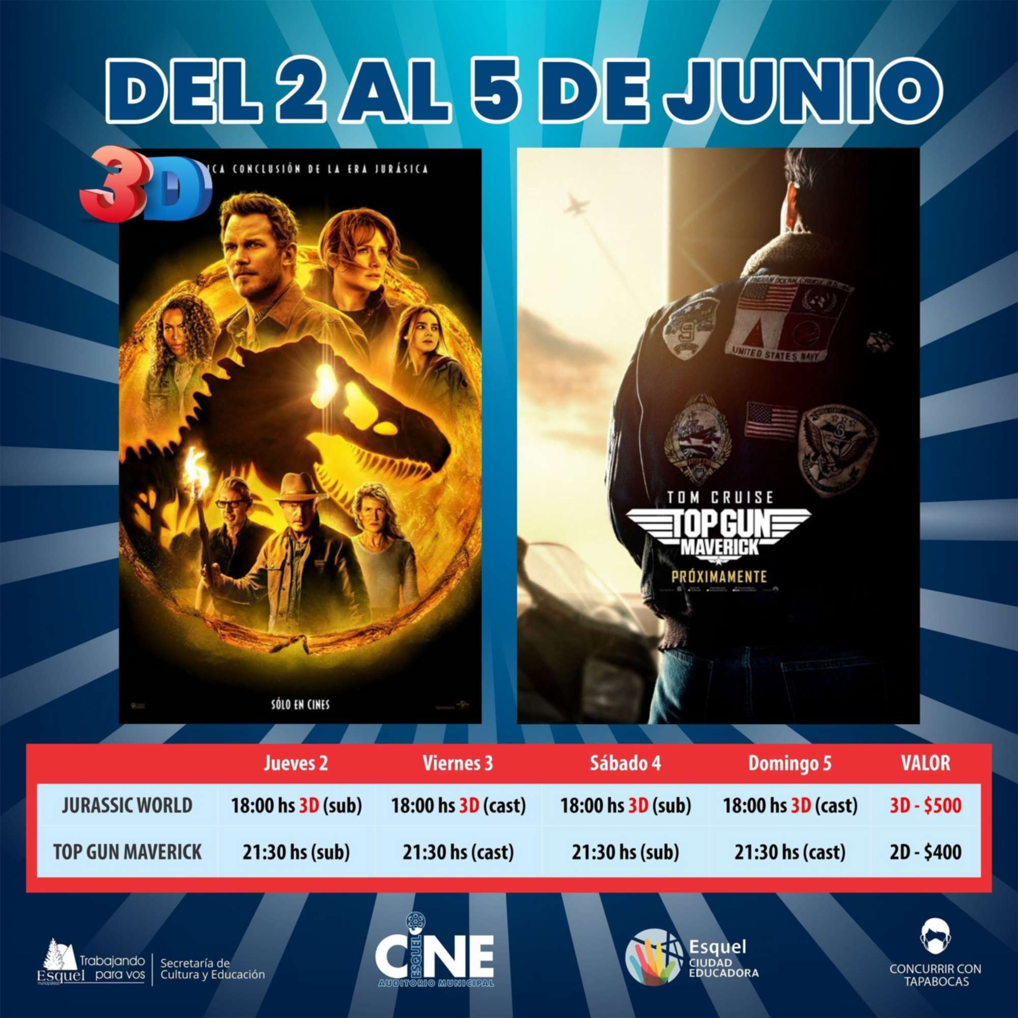 Del 2 al 5 de junio se presentará «Jurassic World Dominion», una secuela de la película «Jurassic World: el reino caído». Las entradas ya están a la venta en la boletería del Auditorio Municipal a $500.
