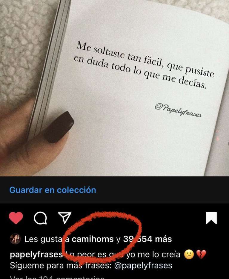 El periodista Ángel de Brito detectó que la modelo indicó que le gusta una llamativa reflexión sobre el amor. “Me soltaste tan fácil, que pusiste en duda todo lo que me decías”, dice el posteo de Instagram al que Homs le dio “like”.