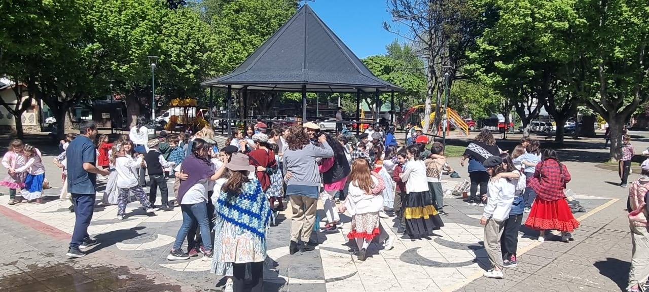 Lorena Albornoz, directora de la Fundación Educativa Esquel, indicó que «los docentes juntos a sus estudiantes decidieron festejar con la comunidad educativa y por eso hemos venido a la plaza a bailar, recitar coplas, repartir tarjetas que recuerdan el día y tortas fritas, y a pasar un día distinto que revaloriza nuestras tradiciones».