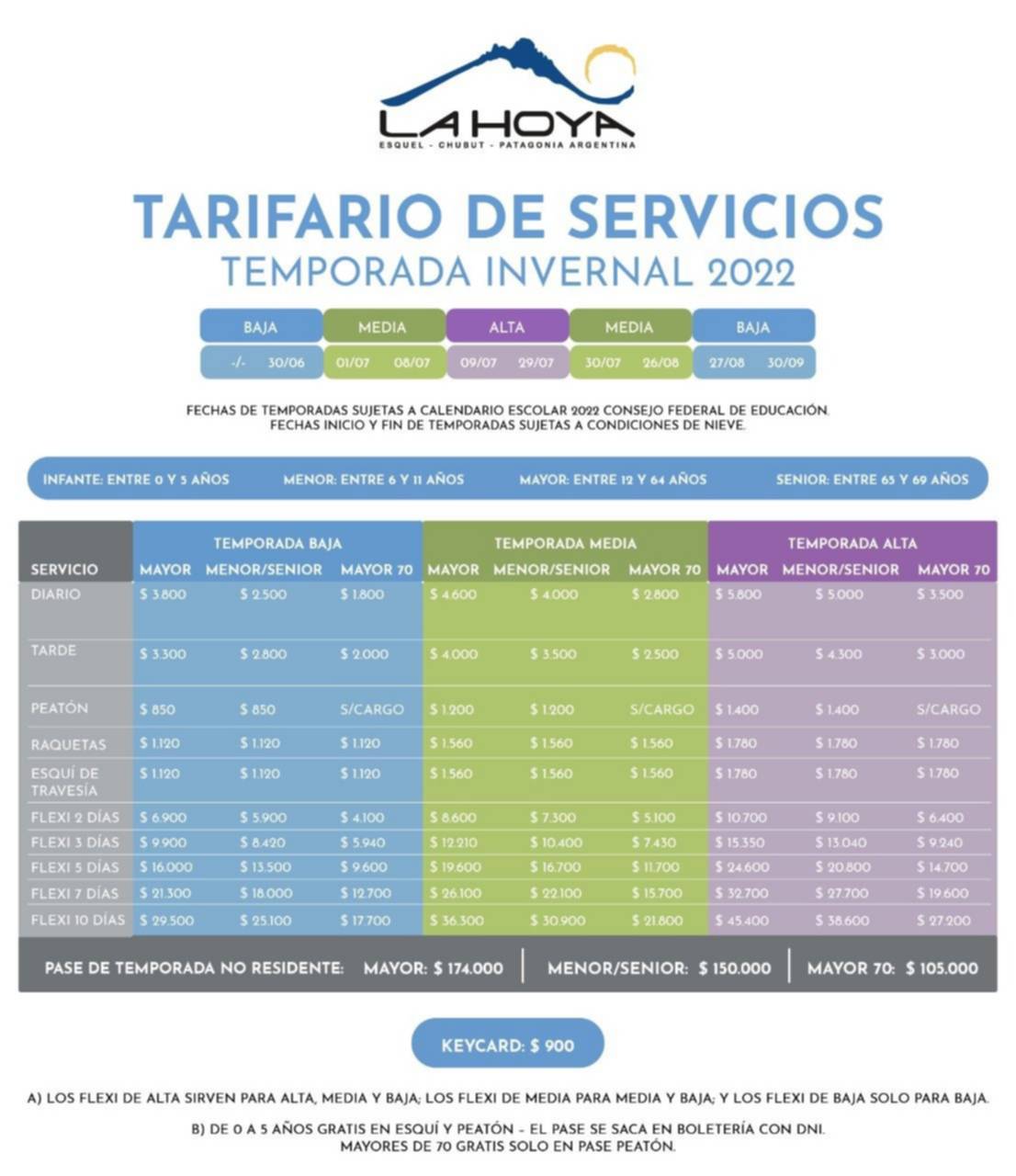 De esta forma, el pase de temporada no residente para mayores se ubica en un valor de $124.000; categoría menor/senior $150.000 y mayor 70 $105.000. Además, hay existen distintas tarifas vinculadas a los numerosos servicios que ofrece La Hoya.
