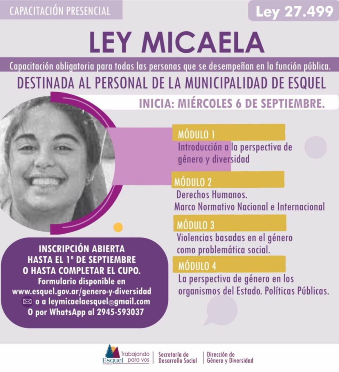 La inscripción se realiza mediante el formulario: https://forms.gle/jpUZ46JgeovERBu88 o por correo a leymicaelaesquel@gmail.com, con tiempo hasta el viernes 1 de septiembre o hasta completar el cupo, o por teléfono al 2945-15583037.