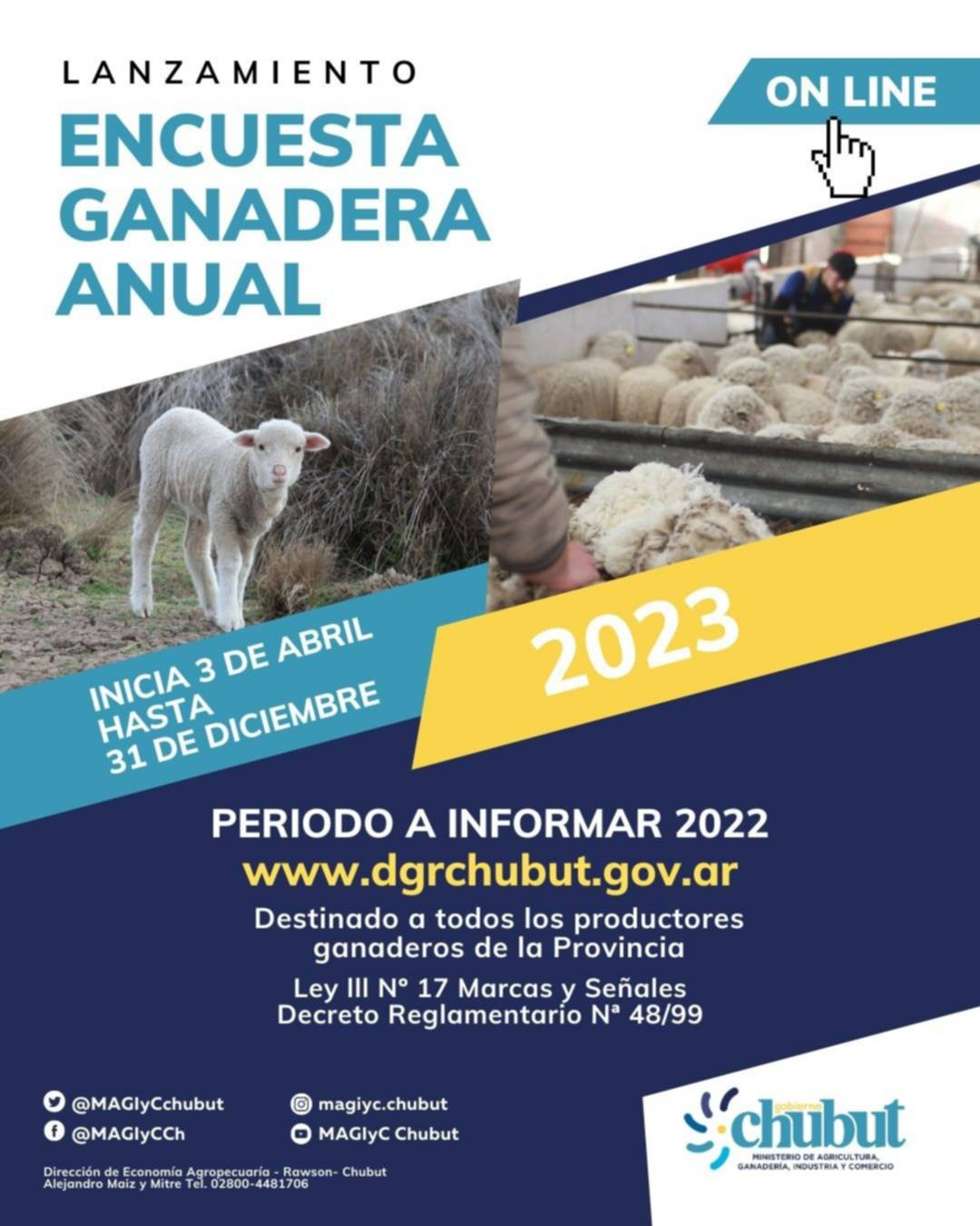El Gobierno del Chubut, a través del Ministerio de Agricultura, Ganadería, Industria y Comercio, recuerda a productores y productoras que se encuentra vigente la Encuesta Pecuaria -en su modalidad online- hasta el 31 de diciembre.
