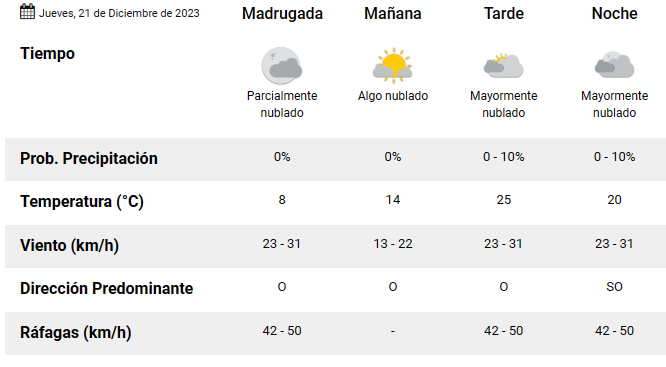 La jornada comienza con un cielo algo nublado acompañado de una temperatura de 14°C. En horas de la tarde, se elevará a 25°C y se esperan vientos de 23 y 31 kilómetros, mientras que a la noche estará mayormente nublada.