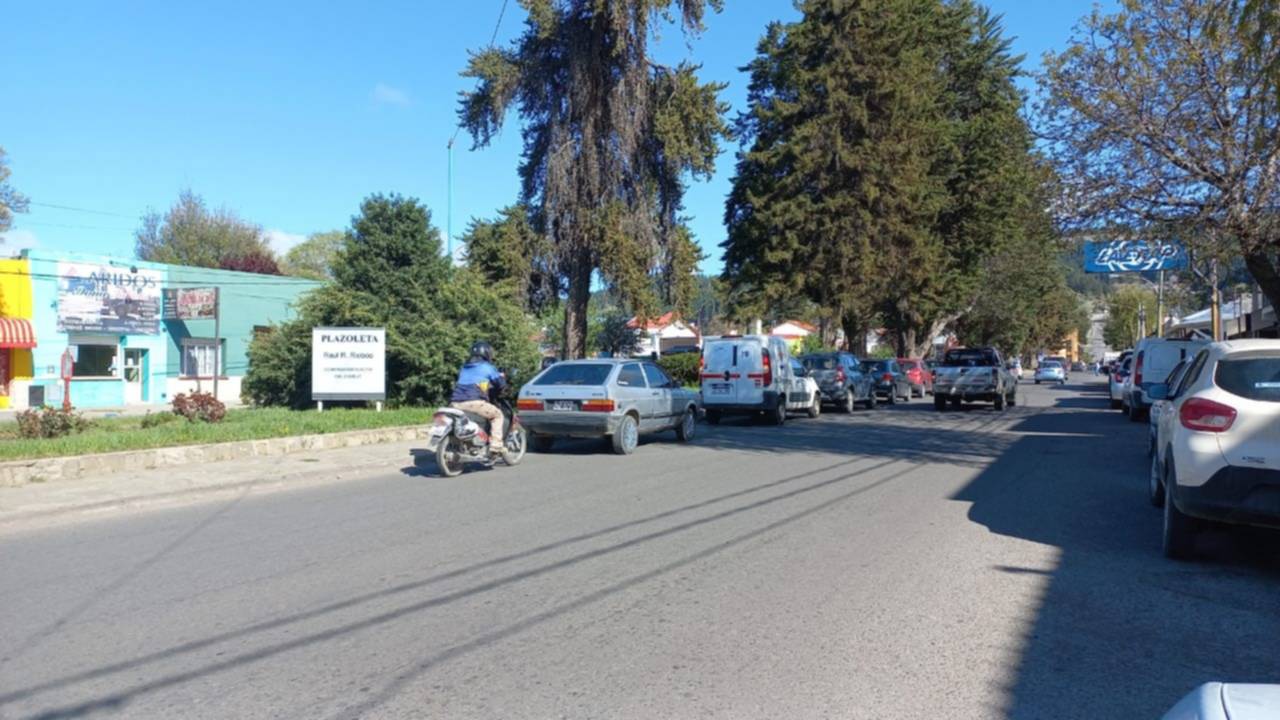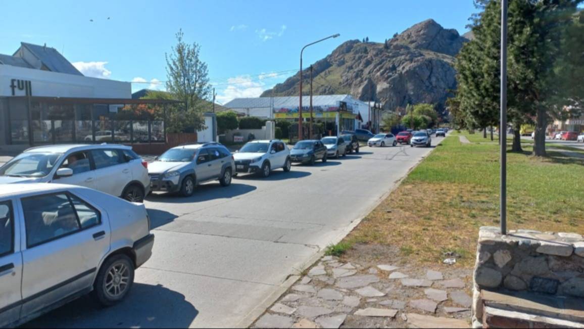 La imagen se repite en la estación de servicio céntrica ubicada en la localidad de Trevelin, donde se observa gran acumulación de vehículos.