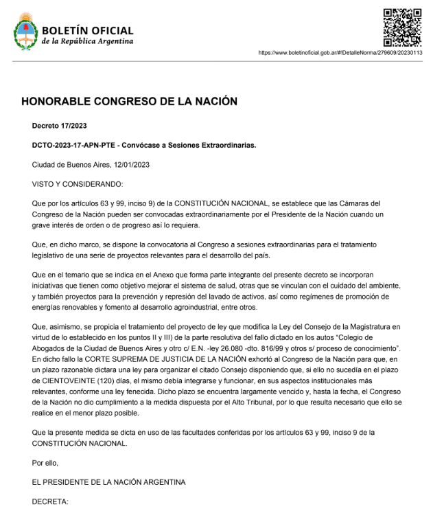 Se publicó en el Boletín Oficial la convocatoria para que el Congreso trate un amplio abanico de temas; juicio a la Corte, Consejo de la Magistratura y la modificación del Presupuesto, entre los tópicos más controversiales.