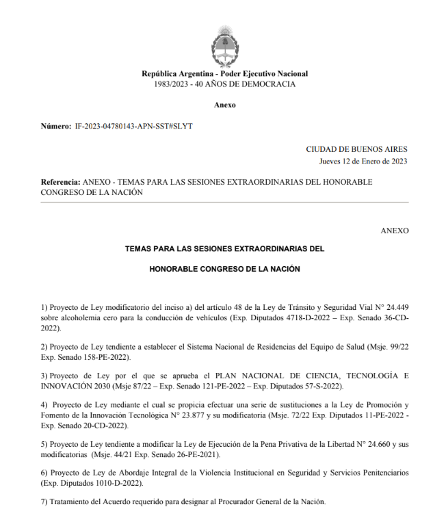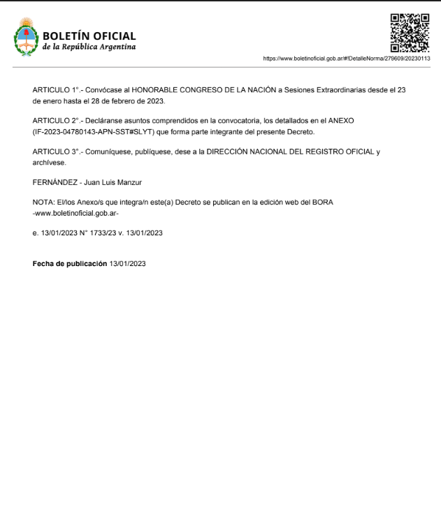En el Boletín Oficial se publicó el decreto 17/2023 firmado por Alberto Fernández y su jefe de Gabinete, Juan Manzur. La norma habilita a que los legisladores sesionen desde el próximo 23 de enero, una semana después de lo que se había pensando inicialmente.