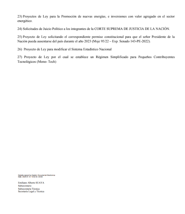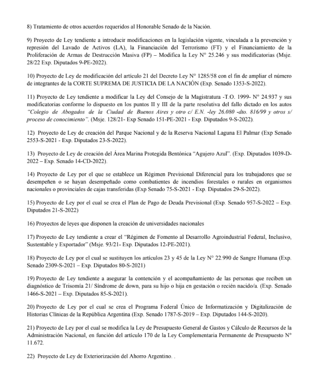 A esa iniciativa, se le sumó el pedido para elevar el número de integrantes de la Corte Suprema de Justicia. Figura en el número 10 del listado. Según el texto de la convocatoria, se busca la modificación del artículo 21 del Decreto Ley N° 1285/58 “con el fin de ampliar el número de integrantes de la Corte Suprema de Justicia de la Nación”.