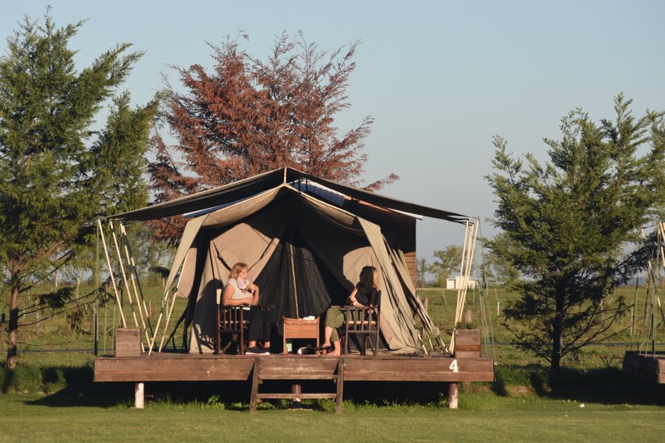 A 120 kilómetros de la ciudad de Buenos Aires, a orillas de la laguna de Lobos, Refugio Natural Glamping combina un ambiente sociable en su zona de costa con cervecería y mesas al aire libre, al mismo tiempo que ofrece intimidad y calma en el sector de carpas, separadas entre sí por 20 o 30 metros, semiocultas en el bosque. Las 800 hectáreas de la laguna implican una playa con arena, kayak de alquiler para remar horas, pesca embarcada de tarariras o desde tierra en los juncales y esquí acuático, banana y gomón. En la cervecería se arman guitarreadas –hay una guitarra de uso público– y a un costado hay una tirolesa de uso libre sobre un estanque. Desde la cervecería se suele mirar el atardecer sobre el agua. Las carpas, los módulos de baño, las sillas y mesas y la cervecería, están hechos con madera reciclada del bosque y chapa: Refugio Natural carece de cemento. Hay 18 carpas en un bosque de 16 hectáreas con centenares de pájaros donde se hace una cabalgata cada 45 minutos. Hay varios tipos de carpa, algunas equipadas con bolsa de dormir y otras con colchón de goma espuma de alta densidad y entrada de pendrive para el celular. Si bien aquí los baños son compartidos, están a la altura de un glamping: son muy espaciosos con diseño moderno y grifería de calidad –incluso una elegante araña cuelga del techo– y los limpian de manera permanente. Acordes a nuestra época, los carteles indican “hoy me siento hombre” y “hoy me siento mujer”. Hay un gran parque como una pradera con juegos para niños y “para grandulones también”, aclara el dueño Matías Gracia. En la cervecería el fuerte son la pizza al horno de barro y leña, y sándwiches de bondiola, picadas, empanadas y cerveza tirada. Algunos fines de semana hay DJ o bandas en vivo. Cada sábado hay clase de yoga abierta y gratuita. En el bosque de olmos y acacias a veces aparece un zorro gris y en los juncales hay carpinchos, nutrias y garzas pico espátula rosadas. Cada carpa de techo a dos aguas y tela impermeable tiene fogón para un asado o charlar, mesas de madera con bancos, luz eléctrica, sommier y sillón (algunas están frente al lago). El lugar es tan grande que algunos vienen solo a pasar el día bajo un árbol y preparar un asado (se puede traer carpa propia). En la noche, el silencio y la oscuridad son absolutos. Este glamping quizá sea –entre muchos otros– el que mejor logra esa combinación de íntimo confort con espacios de socialización, acordes a los tiempos: entre “las que sabemos todos” ya no están las canciones de Sui Generis.