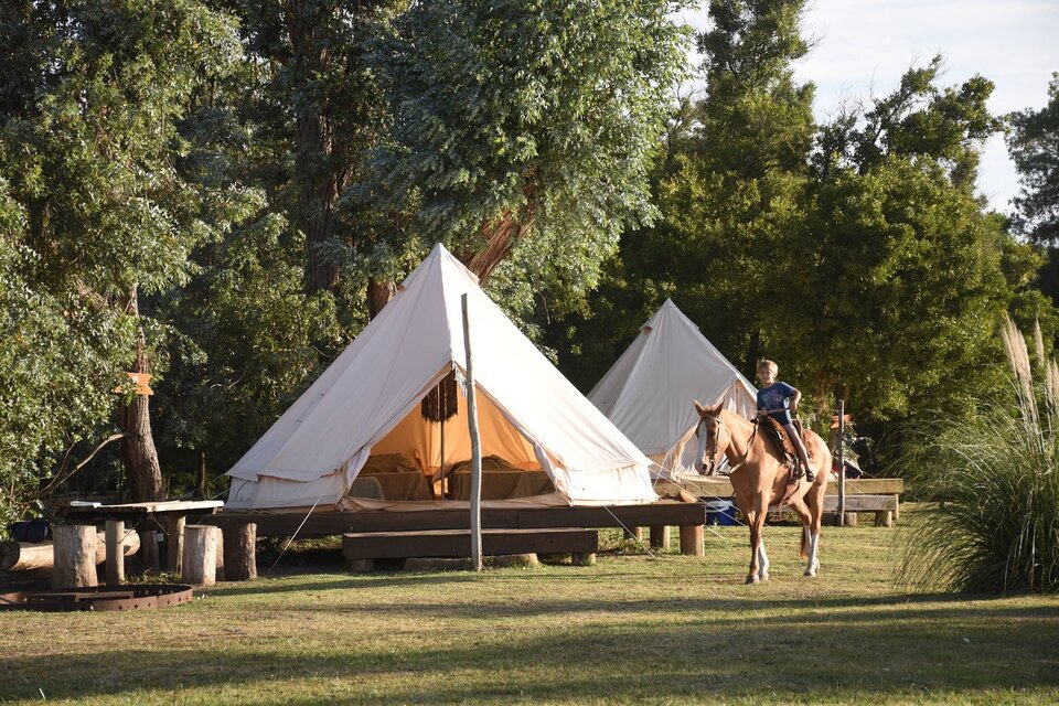 En el Partido de Cañuelas –provincia de Buenos Aires– a 45 minutos del centro de Buenos Aires, Puesto Viejo es un lujoso glamping dentro de una estancia de 225 hectáreas con seis campos de polo –mirar un partido es un plus dominical–, un gran laberinto vegetal con paredes de 4 metros de alto, restaurante de campo y lago con garzas, gallaretas y una isla con puente. Hay 20 tiendas de alto diseño con lona reforzada elevadas sobre un deck con gazebo, media sombra y sillas con mesita para mirar la inmensidad de la Pampa Húmeda. Las tiendas están alfombradas y tienen dos camas separadas y dos ventanales laterales con mosquitero –igual que la entrada– que dejamos abiertos a la noche. Estas tiendas se usaron en el rally París-Dakar y les adosaron un baño de madera tan grande como la carpa. La estadía incluye cabalgata para explorar el campo en uno de los 300 ejemplares de la caballeriza (o en carruaje). Las carpas están alineadas en L mirando a un césped como de golf con fogón en el centro. En la mañana salimos a caminar por las arboledas entre una leve capa de niebla en soledad. El desayuno es en mesas al aire libre y el almuerzo un asado en el restaurante con ventanales o bajo la galería (la cena es a la carta). Al estar alejados de la ciudad, el cielo es muy oscuro y las estrellas titilan más: oímos el chistido de una lechuza, el trompeteo de un chajá, el canto de grillos, mugidos, el chillido histérico de los teros y relinchos lejanos. La estancia es como un gran jardín arbolado con palmeras egipcias, hileras dobles de álamos en caminos internos, pinos y montes de eucaliptus con cotorras.