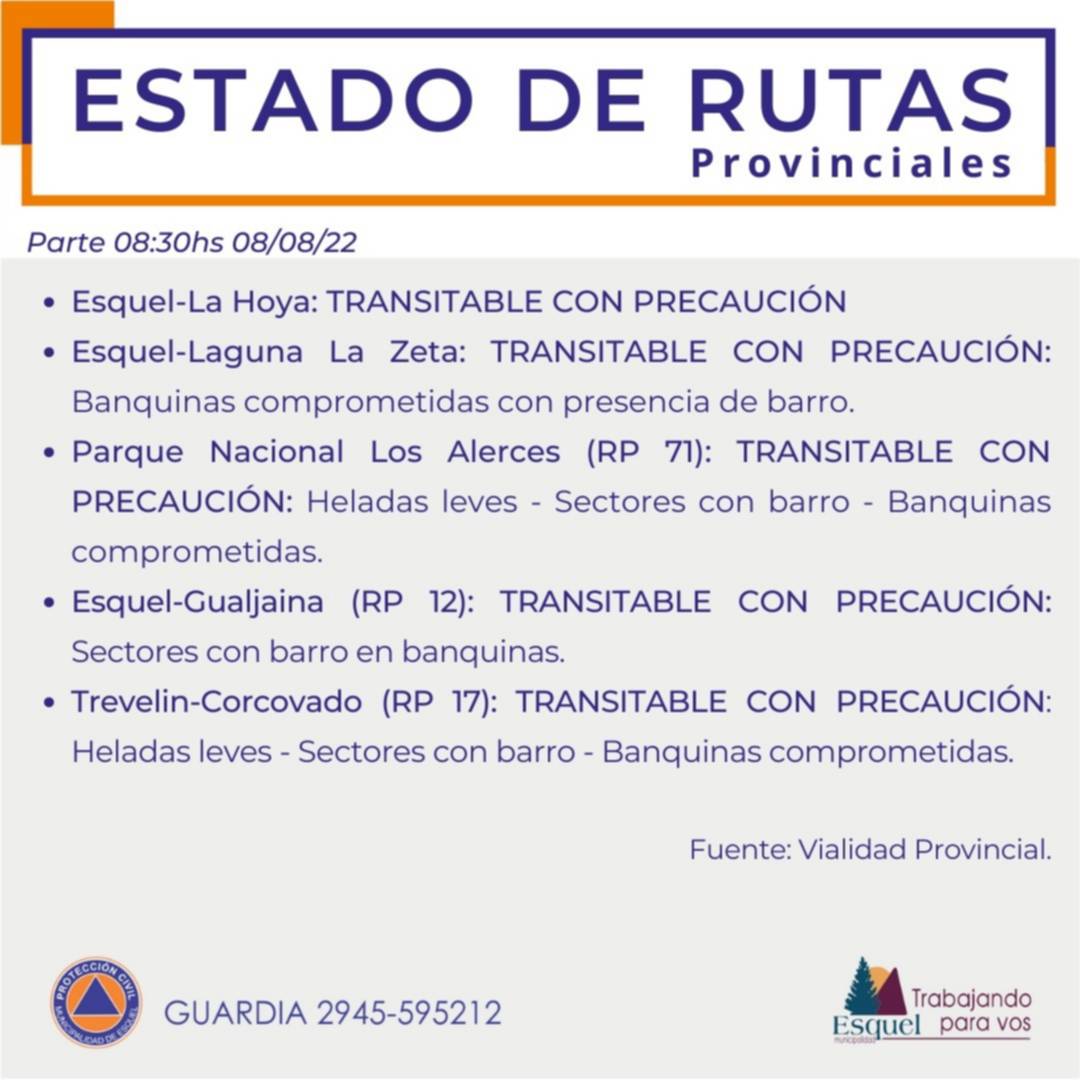 En este sentido, se informó que la Ruta Nº 259 que conecta Esquel -Trevelin, se encuentra transitable con precaución por la calzada húmeda.