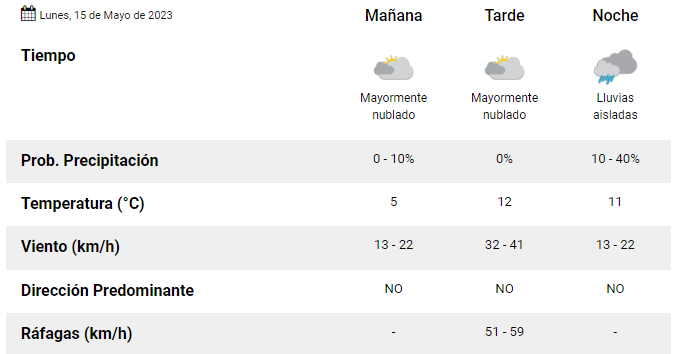 Según la información que brinda la página oficial del Servicio Meteorológico Nacional, este día lunes en la ciudad de Esquel, tendremos una temperatura máxima de 12°C.