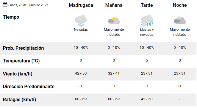 El Servicio Meteorológico Nacional (SMN) anunció para este lunes 26 de junio una temperatura mínima de 0°C y una máxima que alcanzaría los 5°C.