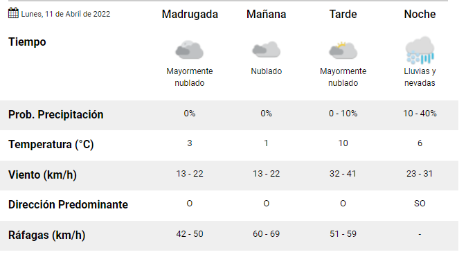 Según los datos oficiales que brinda la página del Servicio Meteorológico Nacional, este día lunes en la ciudad de Esquel tendremos una temperatura máxima de 10°C.
