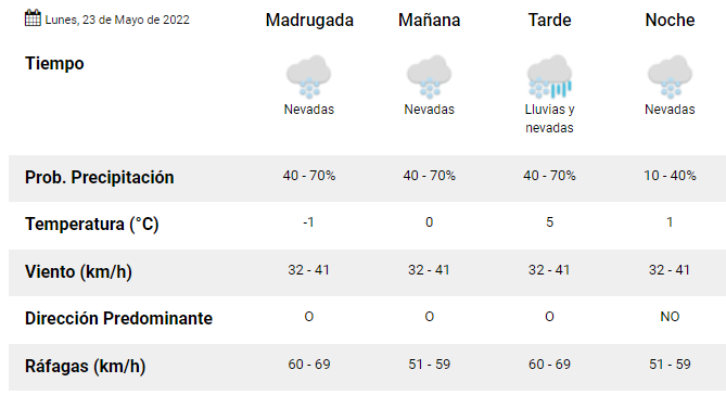 Según informa el sitio oficial del Servicio Meteorológico Nacional, este día lunes en la ciudad de Esquel, tendremos una temperatura máxima de 5°C.