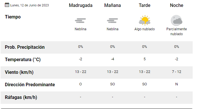 Según la información oficial que nos brinda la página web del Servicio Meteorológico Nacional, este día lunes en la ciudad de Esquel, tendremos una temperatura máxima de 5°C.