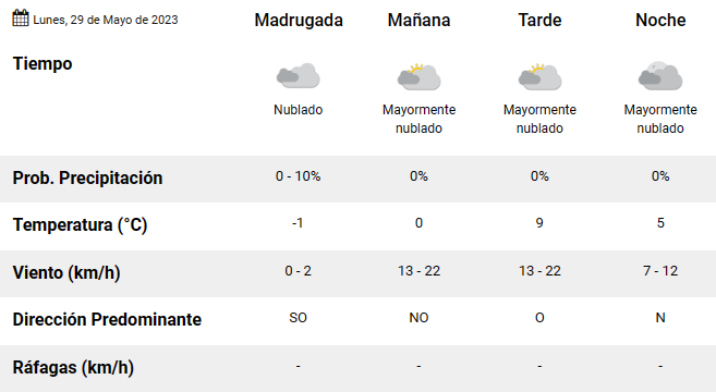 La jornada comienza con un cielo nublado y una temperatura de 0°C. En horas de la tarde, se elevará a 9°C, mientras que a la noche disminuirá a 5°C y seguirá mayormente nublado.