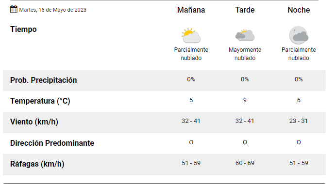Según la información oficial que brinda la página web del Servicio Meteorológico Nacional, este día martes en la ciudad de Esquel, tendremos una temperatura máxima de 9°C.