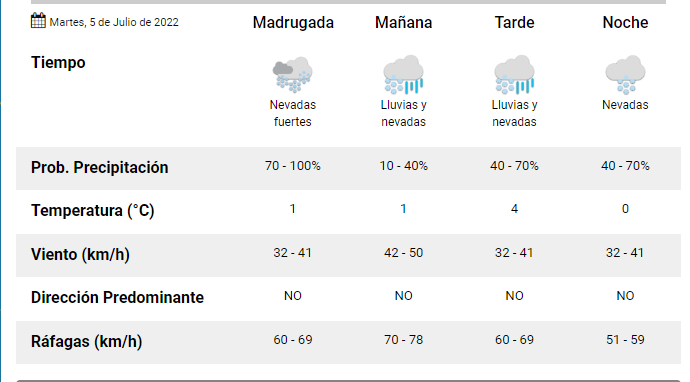 Se anuncian fuertes nevadas, lluvias y ráfagas de viento para el transcurrir de la jornada.