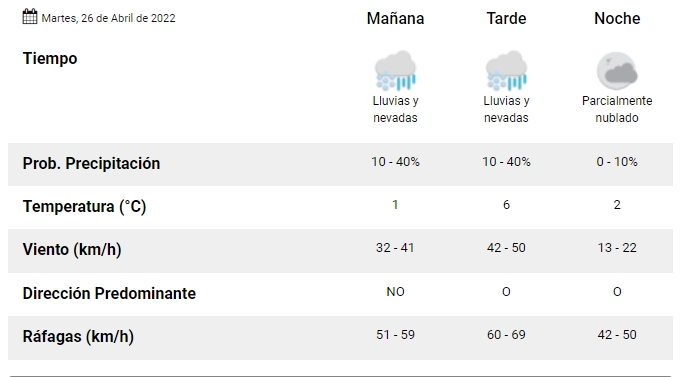 Según los datos oficiales que brinda la página del Servicio Meteorológico Nacional, este día martes en la ciudad de Esquel, tendremos una temperatura máxima de 6°C.