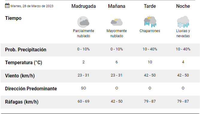 Según la información oficial que da a conocer el Servicio Meteorológico Nacional a través de su página web, este día martes en la ciudad de Esquel, tendremos una temperatura máxima de 10°C.