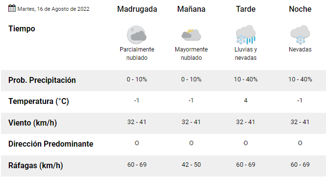 La jornada inicia con un cielo mayormente nublado y una temperatura de -1°C. En horas de la tarde, habrán lluvias y nevadas acompañadas de vientos de 32 y 41 kilómetros, mientras que a la noche la temperatura será de -1°C.