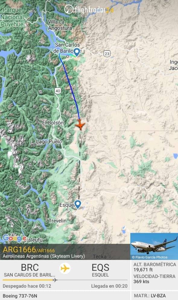 El vuelo AR1666 de Aerolíneas Argentinas despegó del Aeroparque Jorge Newbery de la Ciudad Autónoma de Buenos Aires a las 12:41 con destino a Esquel, pero terminó en Bariloche.