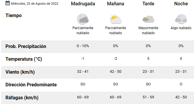 La jornada comienza con un cielo parcialmente nublado con vientos de 42 y 50 kilómetros. En horas de la tarde, las ráfagas disminuirán y estará mayormente nublado.