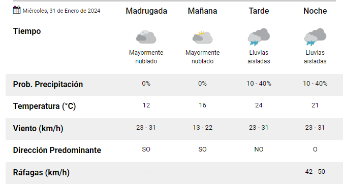 Según la información oficial que brinda el Servicio Meteorológico Nacional, para este miércoles 31 de enero tendremos una temperatura máxima de 24º C.