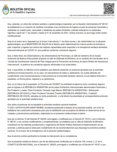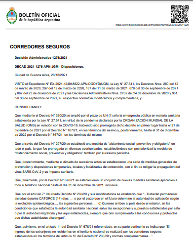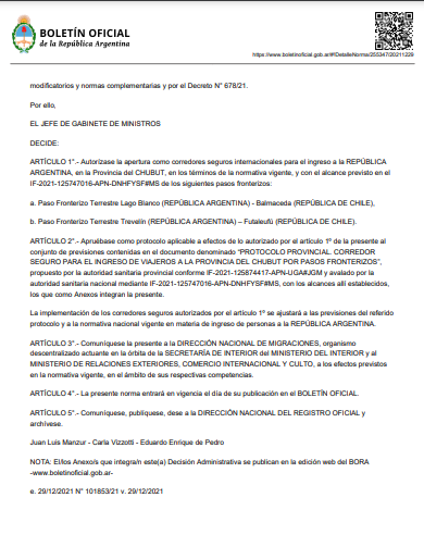 Fue publicado esta mañana en el Boletín Oficial del Gobierno Nacional, afirmando que se trata de un «corredor seguro».