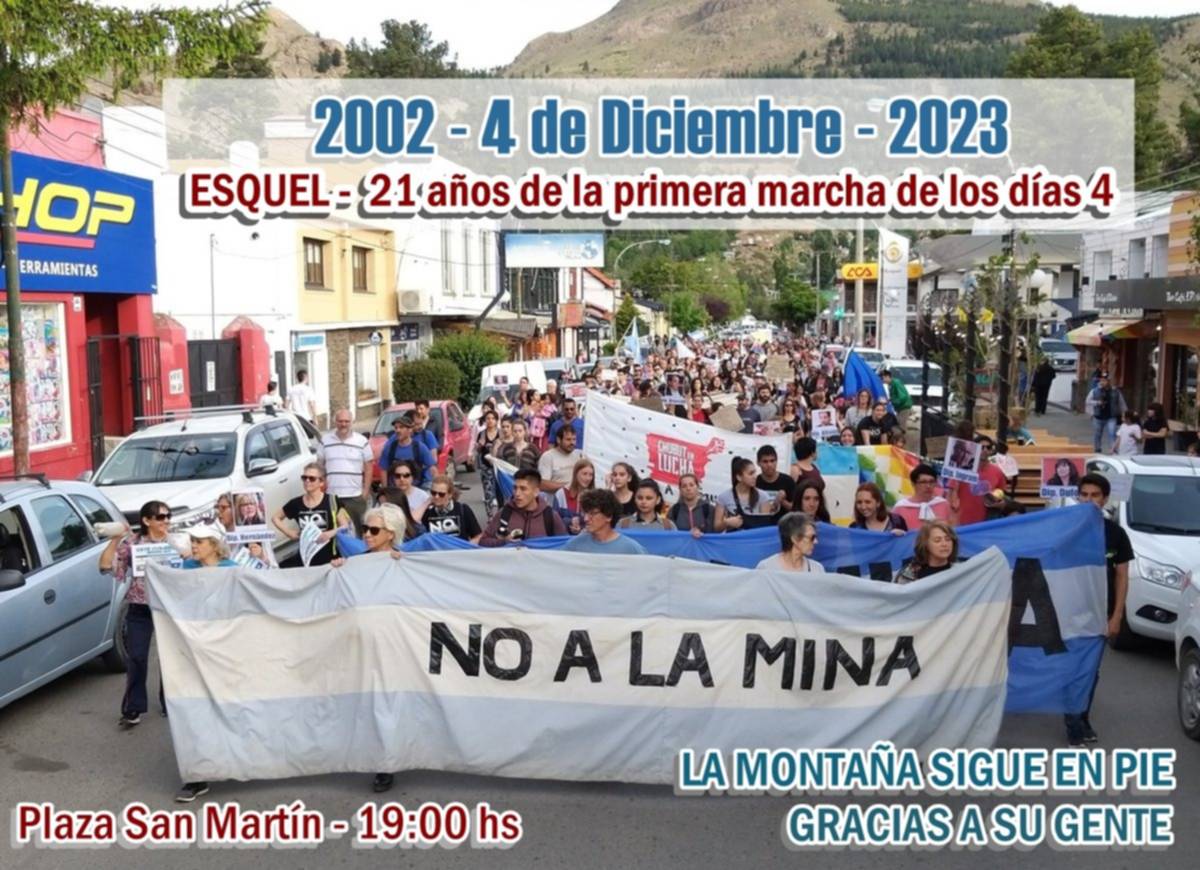 A 21 años de la primera movilización de los días 4, la Asamblea de Vecinos/as Autoconvocados/as por el No a la Mina de Esquel convocan a los vecinos a participar de una nueva actividad en la Plaza San Martín este martes desde las 19:00.