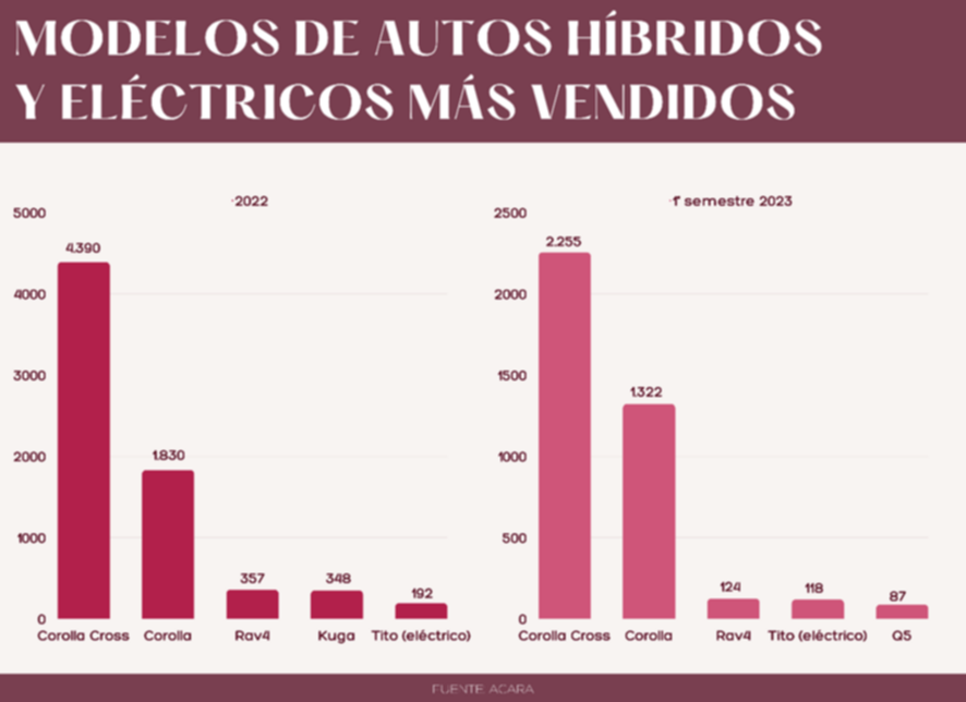Al igual que el año pasado, Toyota sigue siendo el preferido y el protagonista de este mercado. Gracias a sus modelos Corolla Cross (2.255), Corolla (1.322) y RAV4 (124), la marca nipona tiene una participación de más del 80% y comercializó 3.701 unidades en este semestre. Seguidamente, entre los modelos más vendidos están en el cuarto lugar el Coradir Tito con 118 autos y el Audi Q5 en el quinto con 87 unidades.