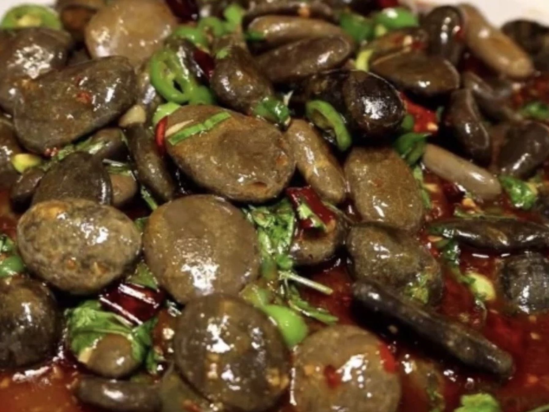Se supone que los clientes chupan las pequeñas rocas para saborear el rico y picante sabor del platillo, que se originó en la provincia de Hubei, en el oriente de China.