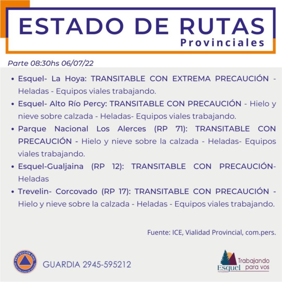 En lo que respecta a la Ruta provincial Nº 259 en dirección a Trevelin, la calzada se encuentra húmeda con sal en sectores y se registran banquinas con barro y nieve.