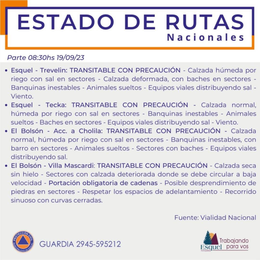 En este sentido, informaron que la Ruta N° 259 en el tramo Esquel – Trevelin la calzada se encuentra húmeda por riego con sal en sectores. Calzada deformada, con baches en sectores. Banquinas húmedas, con barro en sectores. Animales sueltos. Equipos de Vialidad Nacional distribuyendo sal. Viento. Lloviznas. Nevando en sectores. Transitar con precaución.