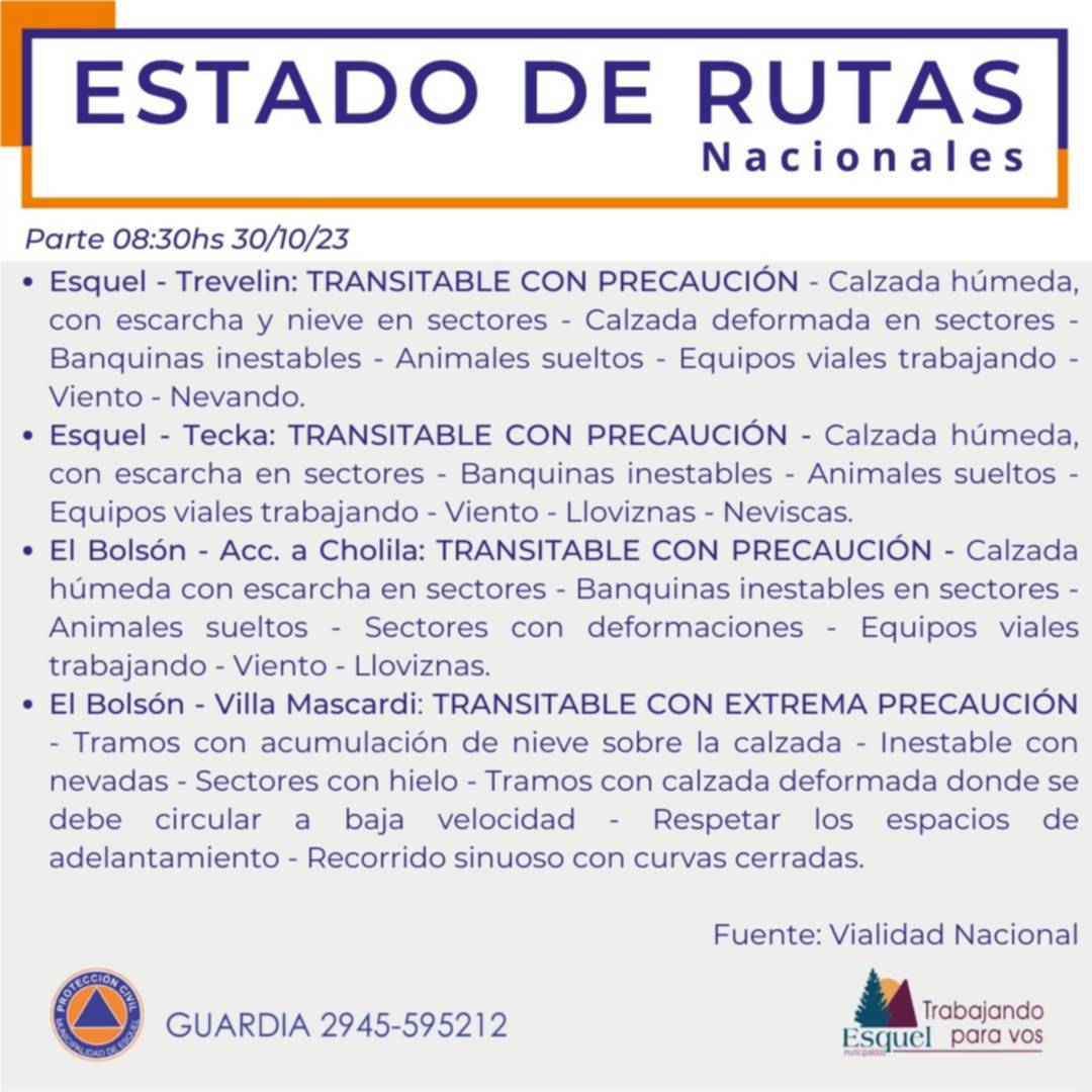 Vialidad Nacional dio a conocer un nuevo parte de rutas previsto para este lunes 30 de octubre en las rutas que conectan Esquel con la región.